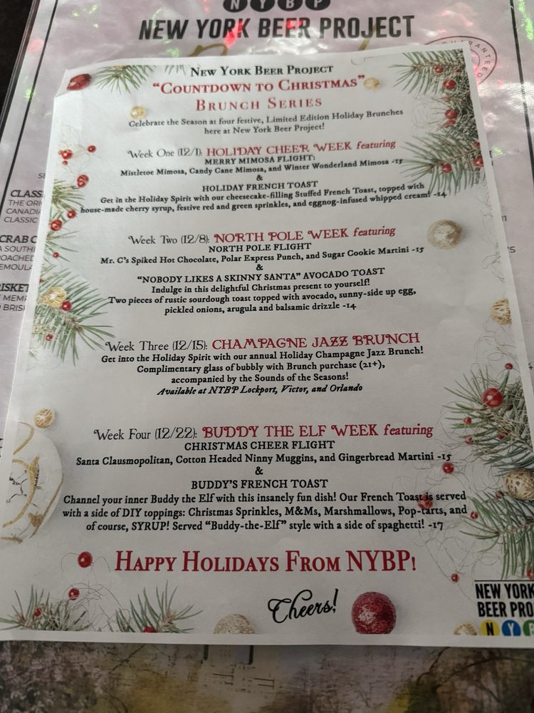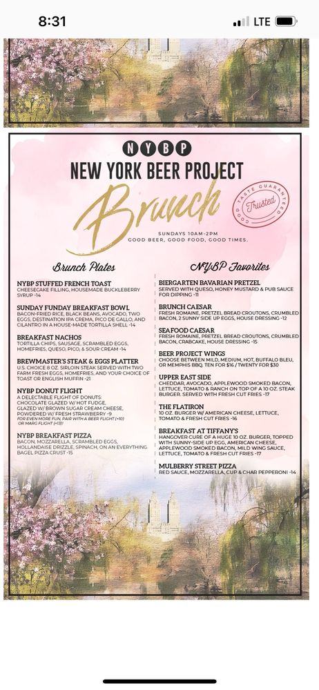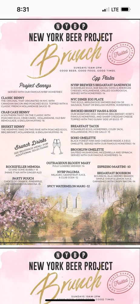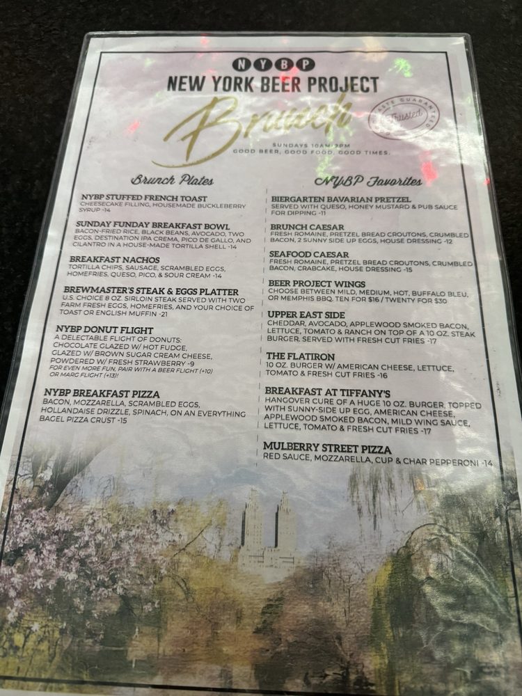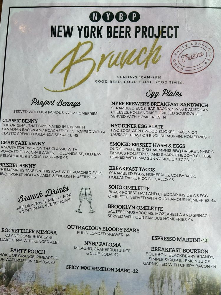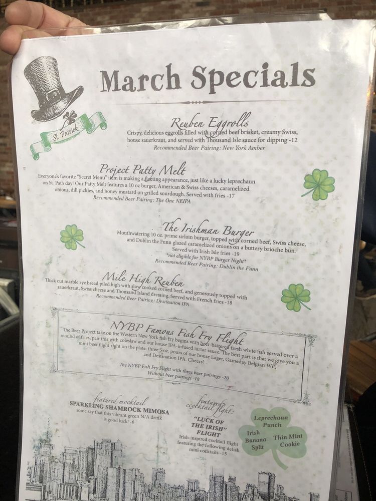 Introducing the menu at New York Beer Project, a trendy and classy venue offering a wide range of dishes and delectable beers. The February specials include mouthwatering options like the Love Child Panini, New Orleans Style Jambalaya, February Wild Game Burger, and NYBP's Famous Fish Fry Flight. To share, indulge in Biergarten Bavarian Pretzel, Buffalo Chicken Wing Dip, Brooklyn Mozzarella Logs, and more. The NYBP Cantina presents Tex Mex Chicken Tacos, Baja Fish Tacos, Boom Boom Shrimp Tacos, and Pot Roast Quesadillas. The highlight is the Chicken Parmesan sandwich, outstanding with perfectly cooked chicken and flavorful marinara sauce. Customer reviews rave about the great food choices and the welcoming vibe of the restaurant. Dining at New York Beer Project promises a delightful culinary experience for all.